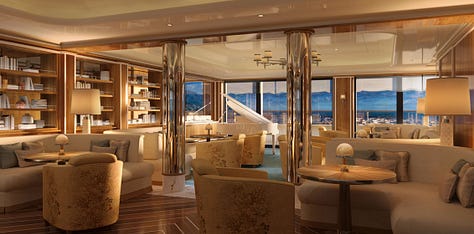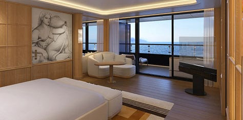 Each suite is designed with expansive terraces and open-air living spaces. The flagship Funnel Suite spans 457 square metres of combined indoor-outdoor space — placing it among the largest single accommodation units ever conceived for a hospitality vessel at sea.